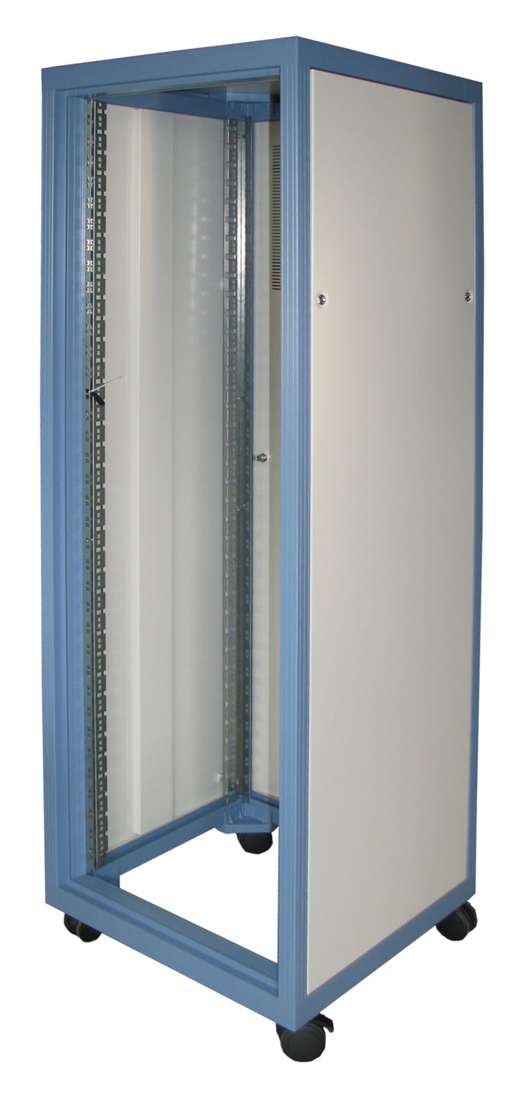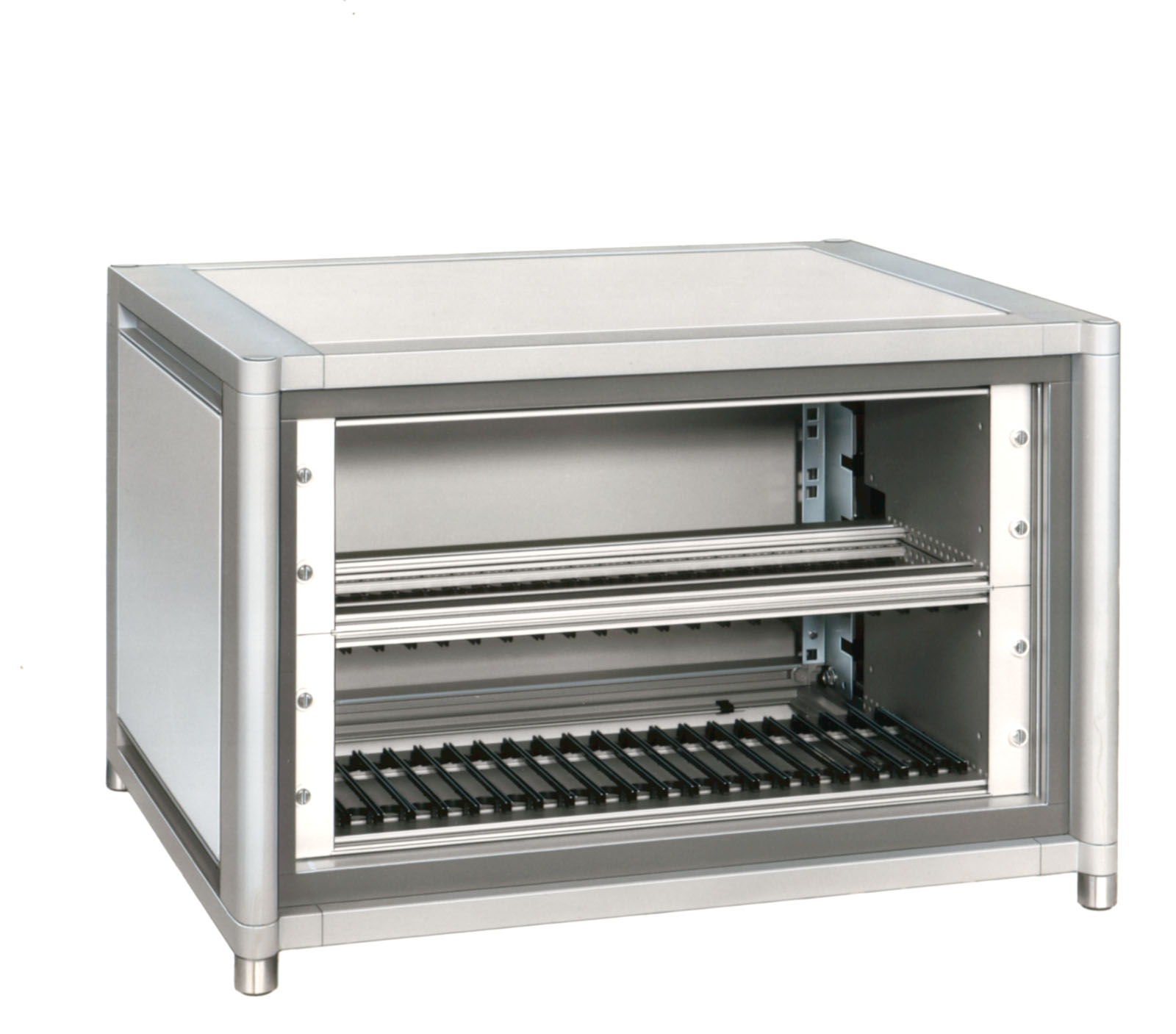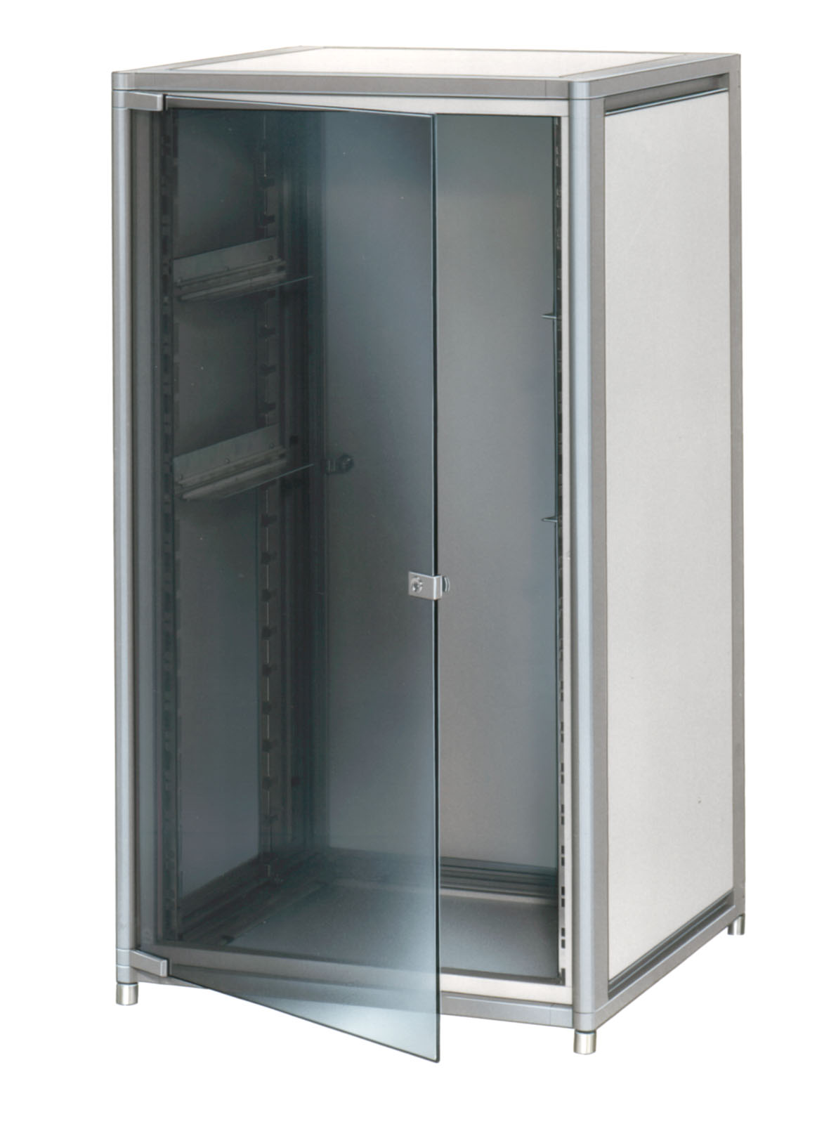 Gehäusetyp mit schlanken, abgerundeten Höhenprofilen und moderner Mehrfarbenoptik. Flexibler Ausbau mit tiefenverstellbaren Rasterschienen. Front- und Rücktüren mit formintegrierten Scharnieren. Stabile, selbsttragende Rahmenkonstruktion aus Aluminium-Strangpressprofilen und Alu-Druckgussecken.