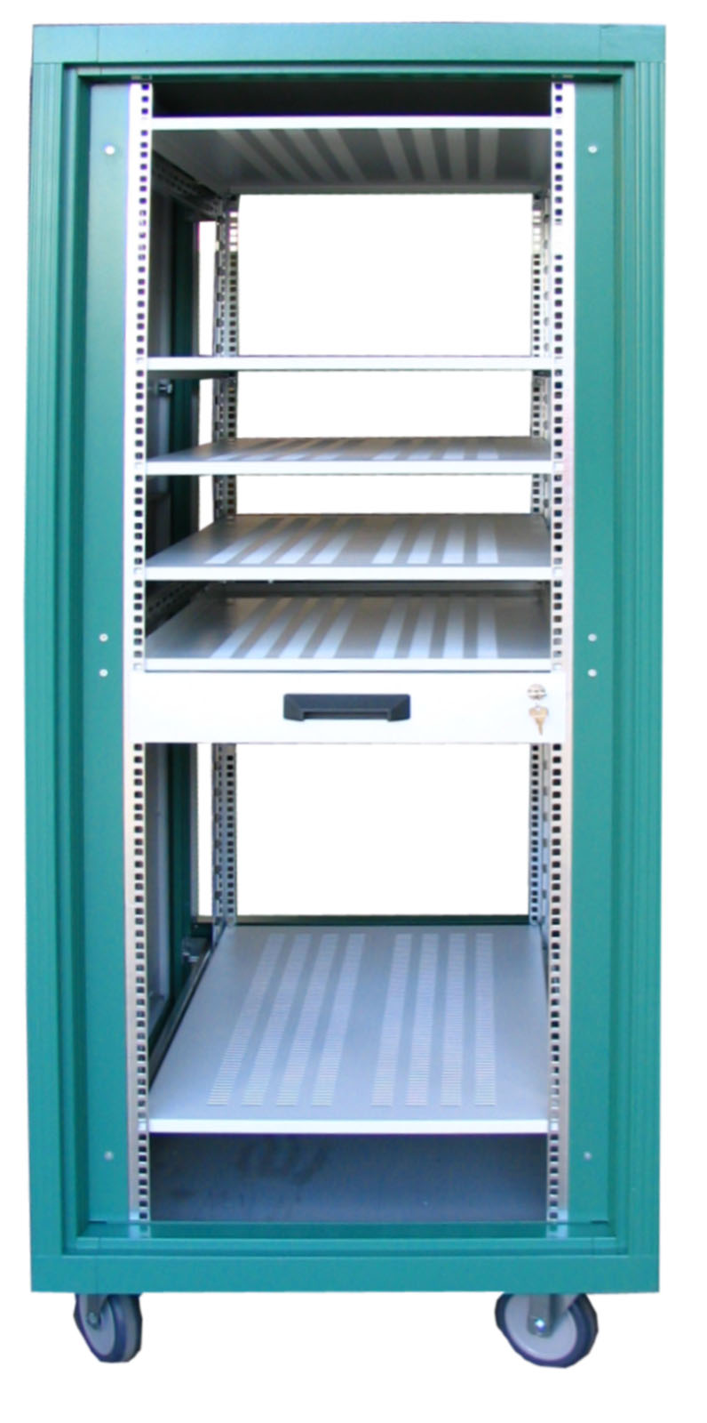 19"-Gehäuse aus 1,25 mm dicken Stahlblech und verglaster Frontür. Fronttür aus ESG (5mm) Sicherheitsglas mit Zylinderschloß. Der Gehäuseboden ist perforiert mit Schlitzen. 4 Gummifüße sorgen für einen sicheren Stand und reduzieren Vibrationen. Ab einer Größe von 4HE sind die Seitenwände mit einklappbaren Tragegriffen ausgestattet, was den Transport erleichtert.