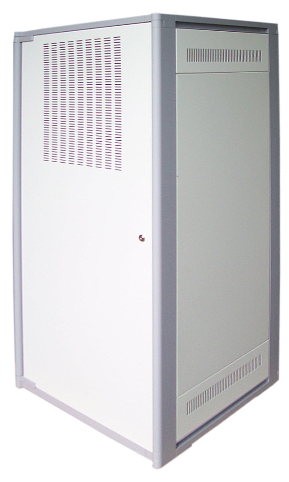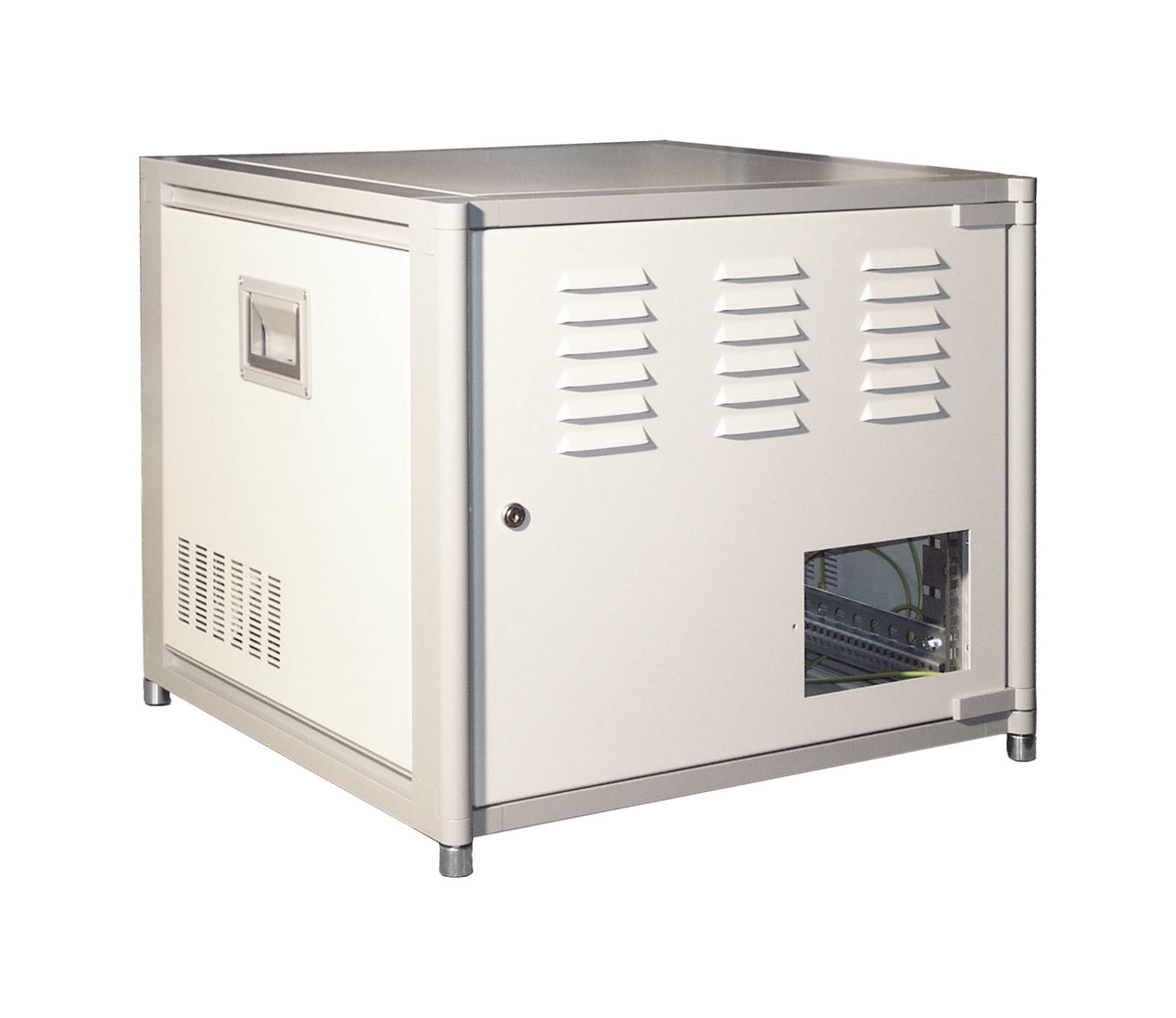 Der Gehäusetyp ist eine selbsttragende Rahmenkonstruktion. Dach- und Bodenrahmen bestehen aus je vier identischen Aludruckguss-Ecken, die mit Strangpressprofilen werkseitig zu einer Einheit verschraubt sind. Vier Strangpressprofile bilden die Eckholme und garantieren hohe Stabilität. Verkleidungen sind abnehmbar und aus 1,0 mm Stahlblech, sodass mehrere Schränke zu Anreihschränken kombiniert werden können.