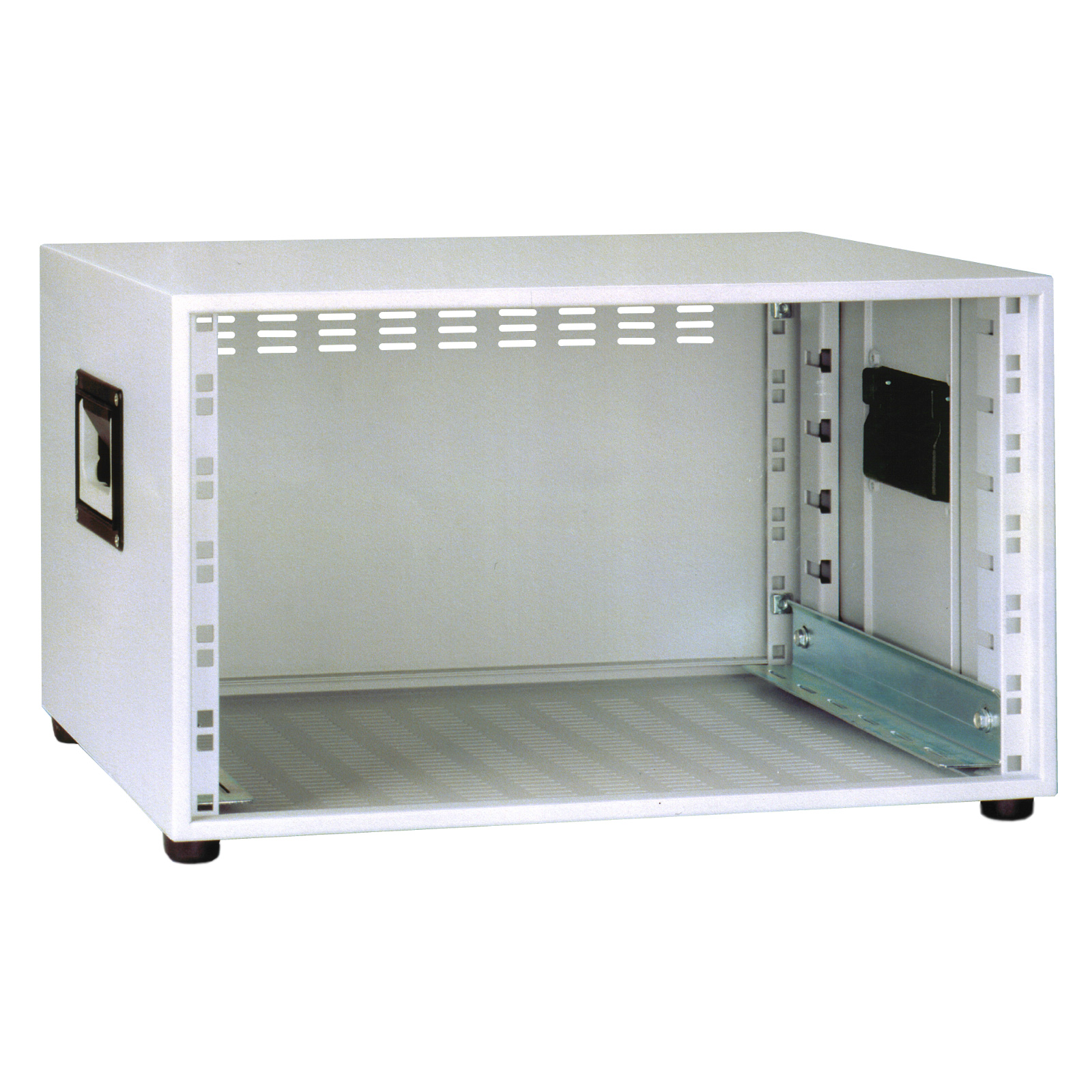 19"-Gehäuse aus 1 mm dicken Stahlblech. Der Gehäuseboden ist perforiert mit Belüftungsschlitzen. Standardmässig sind 2 schraubbare Gleitschienen inkl. Befestigungsmaterial enthalten. 4 Gummifüße sorgen für einen sicheren Stand und reduzieren Vibrationen. Ab einer Größe von 4HE sind die Seitenwände mit einklappbaren Tragegriffen ausgestattet, was den Transport erleichtert.
