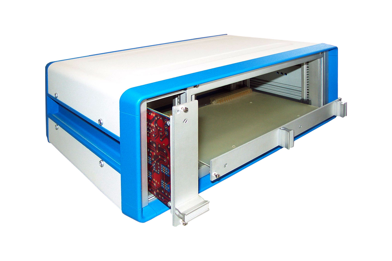 Modernes Tischgehäuse mit eigenständigem Design. Variabel in der Anwendung und modular aufgebaut. Geeignet für den Einbau von 19" System-Baugruppen oder ungenormten Geräten.