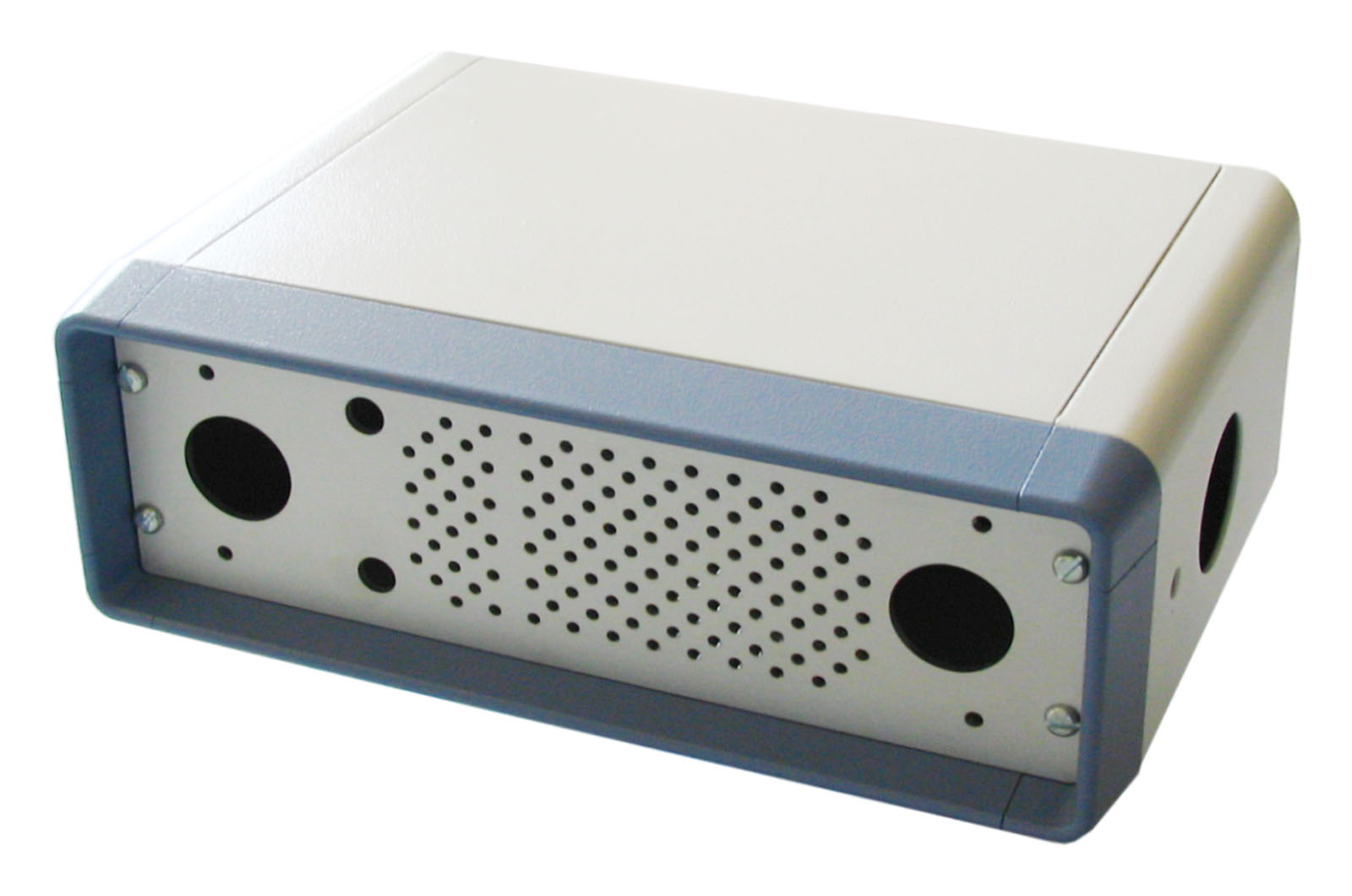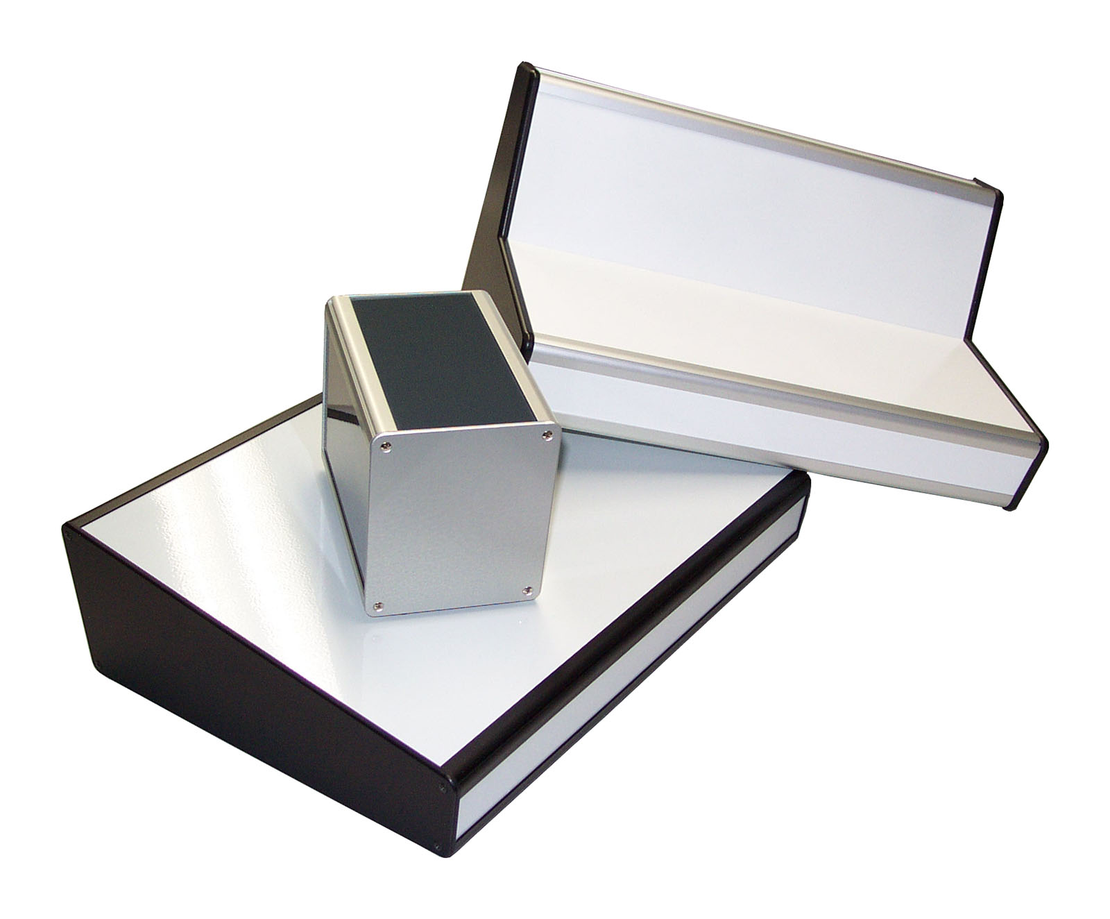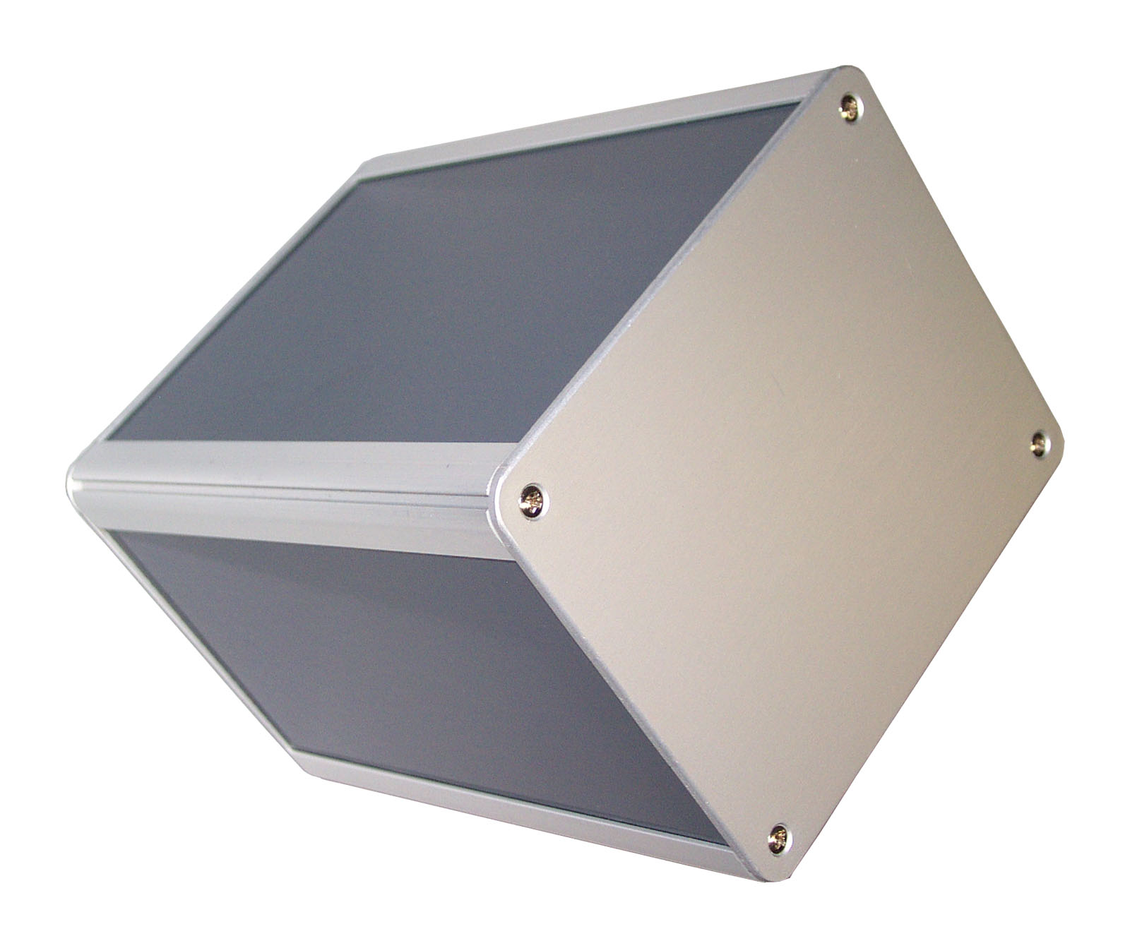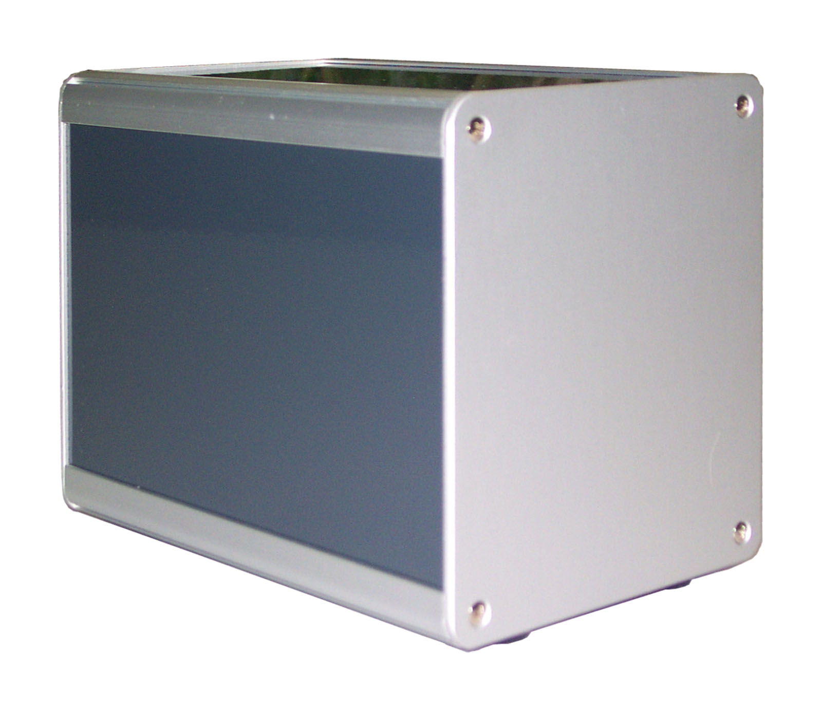 Das Gehäuse besteht aus zwei Alublech-Halbschalen, die seitlich mit Aluminiumprofilen verbunden sind. Innen haben die Seitenprofile mehrere parallele Nuten sowie Lochkanäle. In die Nuten können Elektronikschaltungen oder Montageplatten direkt eingebaut werden. Die Lochkanäle nehmen Gleitmuttern auf.